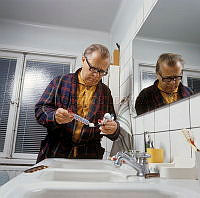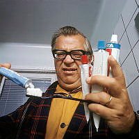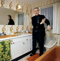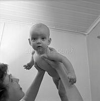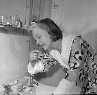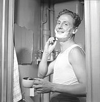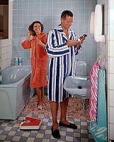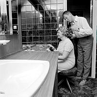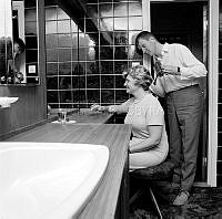 Ett ungt par i badrummet. Mannen i randig badrock använder hårkräm framför badrumsspegeln, och kvinnan i sin röda badrock står och borstar håret. Dåtidens toppmoderna badkar, toalett och handfat återfinns i inredningen, följt av detaljer som badrumsvåg, väggarmatur och badhandukar i olika färger. Sverige 1960-tal