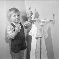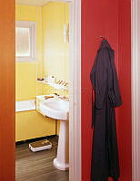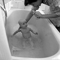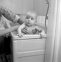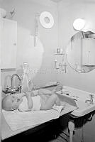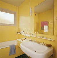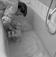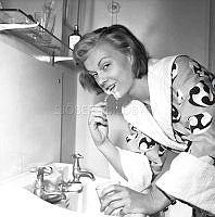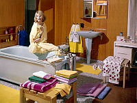 Badrummet 1963. En svensk badrumsinredning från 1960-talet. En ung kvinna sitter på badkarskanten i sin mönstrade badkappa med badmössan i handen. Det är prydligt upplagt högar med mjuka frottehanddukar och badlakan. På klinkergolvet ligger mjuka gula mattor. Handfatet, bidén och badkaret har samma färgton. Sverige 1963