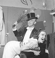Två unga revyskådespelare spexar bakom scenen. Mannen i hög hatt har lagt kvinnan över knäna och har höjt ett knippe påskris. Inte särskilt troligt att han tänker smiska henne på stjärten eftersom båda skrattar och är glada i den udda situationen.