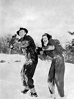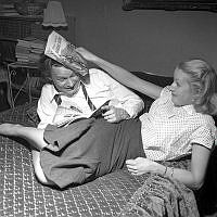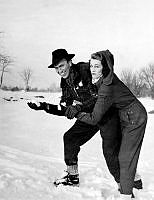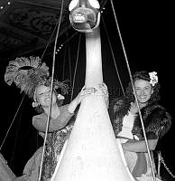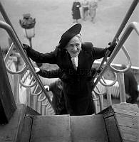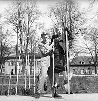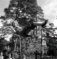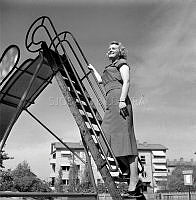 Gå på styltor på 1950-talet. Skådespelerskan AnnaLisa Ericson syns inte riktigt behärska tekniken att balansera på styltorna utan får hjälp på traven av en man som stadgar upp. Trots hjälpen verkar hon förskräckt över upplevelsen eller så har hon extrem höjdskräck. Året är 1956