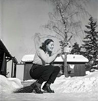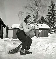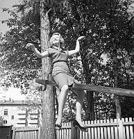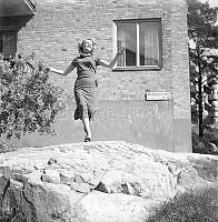 På 1950-talet. En ung kvinna fångad i ögonblicket då hon tar ett skutt på berghällen framför ett hyreshus på Abrahamsbergsvägen i Bromma. Året är 1953.