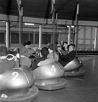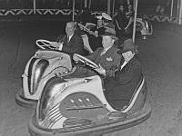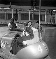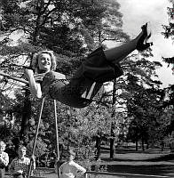 Två unga glada kvinnor åker karusell. De åker runt runt i en stor svan. Sverige 1944