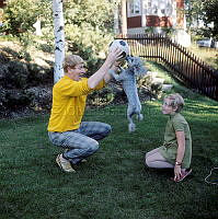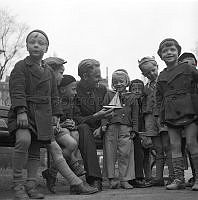 Barn förr i tiden. En ung man har samma fascination för att leka med båtar som barnen som har samlats runt honom. Han håller en liten modell av en segelbåt i handen. Barnen är tidstypiskt välklädda med jackor och mössor. Året är 1942 och Andra Världskriget rasar i Europa men i Sverige går livet sin gilla gång. Det är Sveriges yngste sjökapten. Martin Nyblom, endast 21 år gammal utexaminerad vid Stockholms navigationsskola. En bild ur ett bildreportage som berättar den unge mannens historia. Som femtonåring mönstrade han på lastfartyget Milos av Hälsingborg och var på sjön i fyra år samtidigt som han pluggade på sin sjökaptensexamen. Publicerad i tidningen Se nr 23 1942.