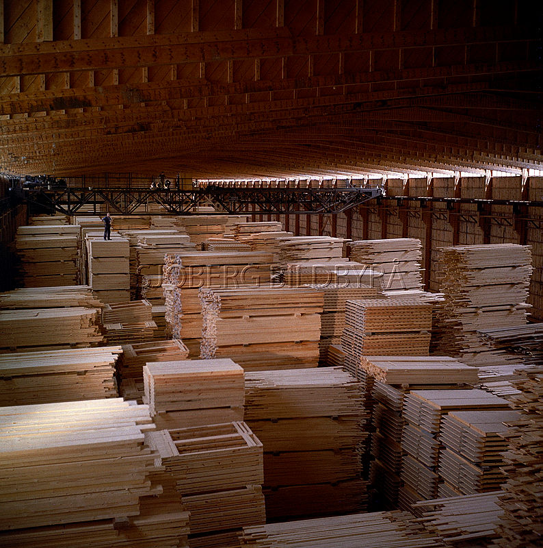 Borohus. Ett anrikt svenskt husföretag med anor från slutet av 1800-talet. Den växande egnahemrörelsen på 1920-talet fick företaget att satsa på hustillverkning i större skala, och företaget Boro hus etablerades i Landsbro utanför Vetlanda i Småland. Namnet är en förkortning av orden: Bo i ro i eget bo. Företaget blev landets största tillverkare av monterbara hus. Fabriksmonterade husmoduler, väggar och inredning gjorde byggmetoden ekonomiskt framgångsrik. Den kooperativa bostadsrörelsen HSB köpte företaget 1936 och drev det fram till 1984. Efter flera konkurser återstår idag inget av den ursprungliga verksamheten. Varumärket Borohus lever vidare med dess fabrik i Mjöbäck i Västergötland. Här i Borohus virkesförråd. Byggnaden som inrymmer 300 000 kubikmeter med en yta av 165 x 38 meter, var vid uppförandet 1946-1947, Europas största träbyggnad med frispännande takkonstruktion. Bakgrunden till byggnaden är Hilding Brosenius utveckling av fribärande trätakstolar. Storleken framgår tydligt när personen som står på en av virkestravarna synes liten i jämförelse. Byggnaden är numera byggnadsminneförklarad. Sverige 1958