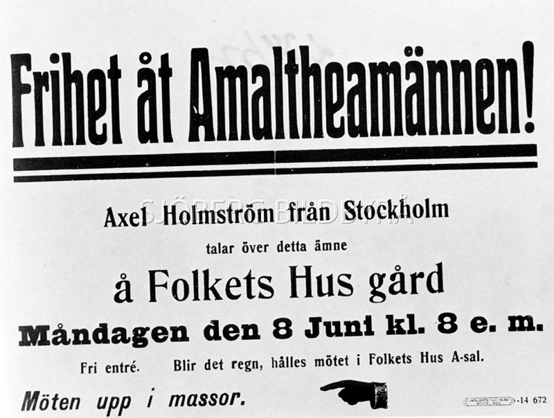Anton Nilson. Född den 11 november 1887-1989. Svensk socialistisk agitator och aktivist som bland annat deltog i det så kallade Amatheadådet 1908. Bombattentatet mot fartyget Amalthea innebar att han kallats Sveriges förste moderne terrorist. Här ett tidningsklipp från tiden för attentatet då en kampanj fördes för att få de dömda frigivna.