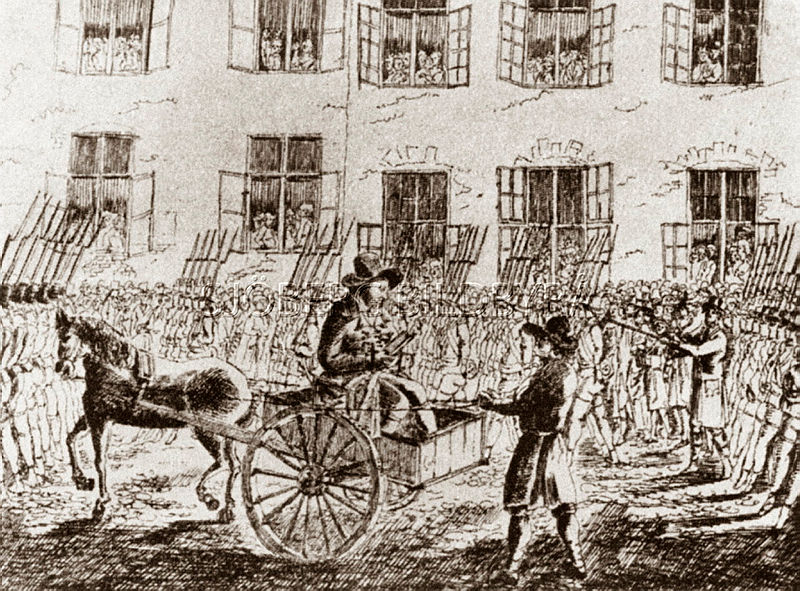 Jacob Johan Anckarström. 1762-1792. Känd som den som mördade kung Gustav III den 16 mars 1792 under en maskerad på Operan i Stockholm. Här fastbunden i händerna gående bakom en vagn på väg till galgbacken utanför Skanstull i Stockholm.