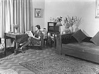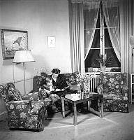 Heminredning förr. En mamma med sin son sitter bekvämt i en soffa och läser tillsammans ur en bok. Soffan och fåtöljerna har alla samma blommiga tyg, och ett bord med spegelglas står mitt i rummet. En golvlampa med tygskärm lyser upp. Sverige 1945