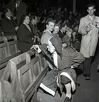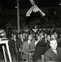 Urpremiären av Povel Ramels första Knäppupp revy Akta Huvet! på Lorensbergs cirkus i Göteborg den 10 oktober 1952. Harry Ahlin agerar sotare och går runt i bänkraderna under föreställningen. Bilden publicerad i tidningen Se nr 42 1952.