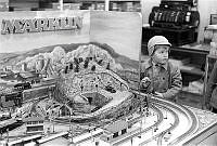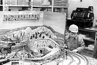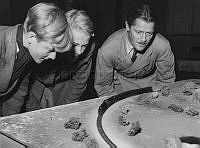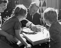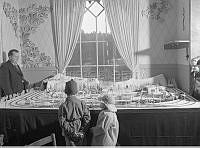 En modelljärnväg 1952. En man vid en större modelljärnväg. Han står vid reglagen som styr tågen. Två pojkar ser beundrande på. Saltsjöbaden. Januari. 1952