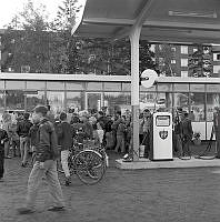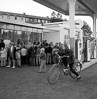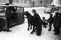 Ponnyn i centrala Stockholm 1956. Man försöker få en liten häst att gå in en taxibil. Taxichauffören står bredvid och ser, likaså en skara småbarn som stannat till och säkert tyckte detta var en udda syn.