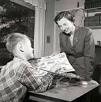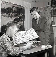 Hobby på 1950-talet. En pojke vid ett bord med en plastmodell av ett amerikanskt bombflygplan modell B29 . Modellbygge och byggsatser var vid den här tiden mycket populära. Det är den amerikanska tillverkaren Aurora Plastics corporations broschyr han ser på tillsammans med en kvinna. Företaget hade sin storhetstid på 50 och 60-talen med just flygplansmodeller som specialitet. Sverige 1956 ref 3091