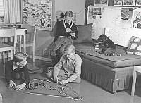 Tre pojkar leker med en Märklin järnväg 1953. Dom sätter ihop rälsen på golvet och lok med vagnar ligger på sängen. Ett typiskt pojkrum där det sitter olika bilder på väggen bakom sängen; fotbollslag, bilar, flygplan. Sverige 1953