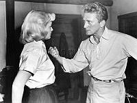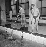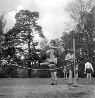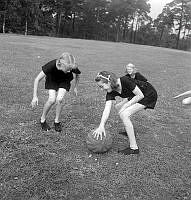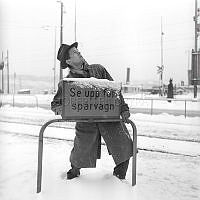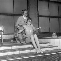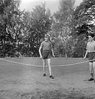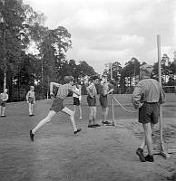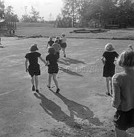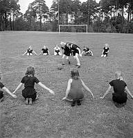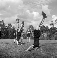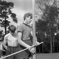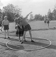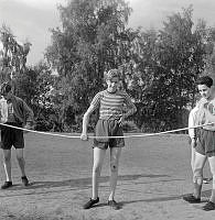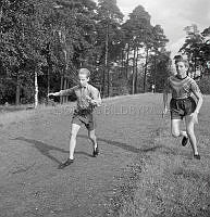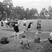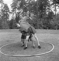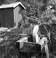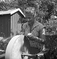 Så ska en slipsten dras. En kvinna sliper en sax på en slipsten. Att göra arbetet själv är extra svårt eftersom hon både vevar och håller saxen i rätt läge samtidigt. Sverige 1958