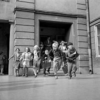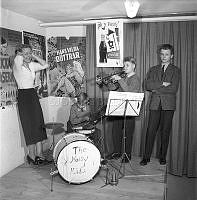 The Noisy Kids 1956. En trummis och en trumpetare står på en enkelt uppbygd scen och spelar. På väggen bakom syns filmaffischer och reklam för Coca-Cola. En kvinna står vid sidan om och håller för öronen. På bastrummans framsida står skrivet The Noisy Kids kapellmästare Peter Jörnstedt.