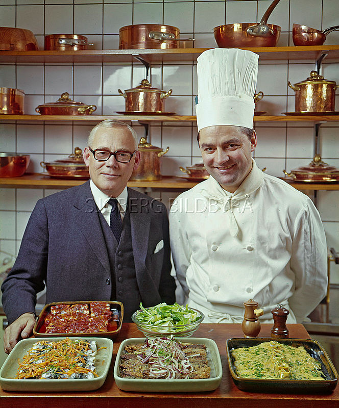 Tore Wretman. 1916-2003. Svensk restaurangprofil. Här med den legendariska kocken och arbetskamraten Werner Vögeli på Operakällaren i Stockholm på 1960-talet. Framför dem fat med smaksatta sillrätter på deras klassiska vis. Två matlegendarer.
